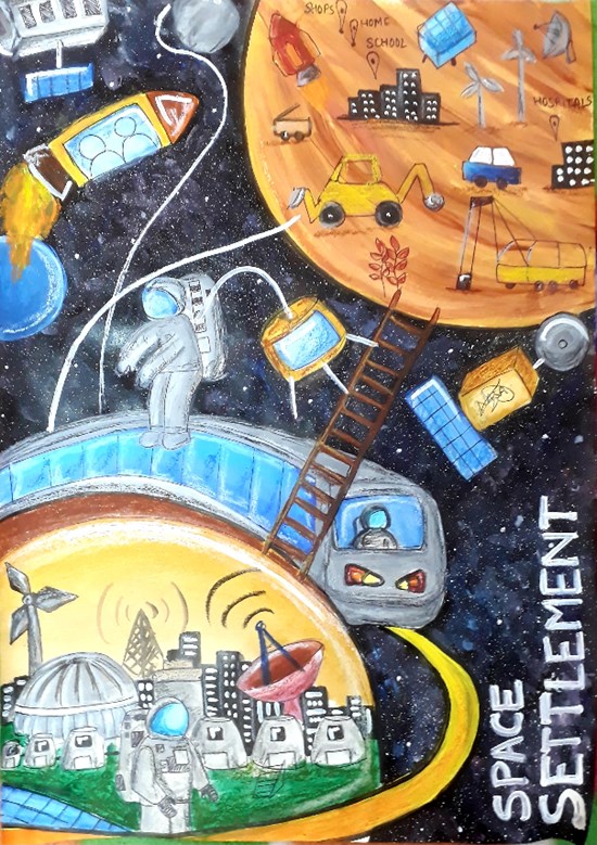Cosmic Colonies: Beyond the Horizon, painting by Child Artist Nishtha Sharma View Portfolio icon Share Facebook Twitter Whats App Pinterest Description -- Art Number 28034 Artwork Title Cosmic Colonies: Beyond the Horizon Artist Name Nishtha Sharma Medium Acrylic on Sheet Information In the vast canvas of the cosmos, my acrylic painting envisions the boundless potential of space colonization. Fusing my passion for astronomy with the strokes of art, this painting is a vivid ode to human ingenuity and the uncharted realms awaiting our exploration.As an astronomy enthusiast and artist, I've poured my fascination for the cosmos into every brushstroke. "Cosmic Colonies" is a visual symphony, inviting viewers to embrace the intersection of science and art. It's my heartfelt expression of optimism for a future where the stars are not just points of light but beacons guiding us toward new frontiers. With each stroke, I hold onto the hope that our collective curiosity will fuel the journey towards a tomorrow where the universe becomes not just our muse but our home.