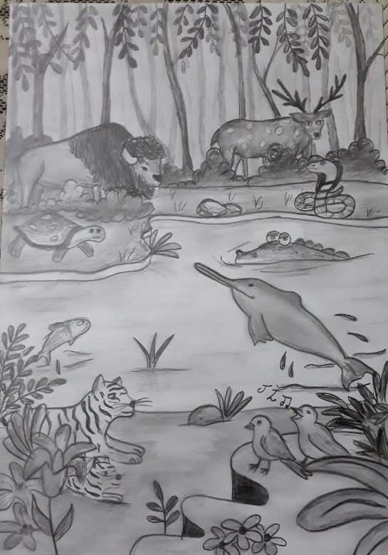 Harmony in the Wilderness, painting by Child Artist Nishtha Sharma View Portfolio icon Share Facebook Twitter Whats App Pinterest Description -- Art Number 28035 Artwork Title Harmony in the Wilderness Artist Name Nishtha Sharma Medium Pencil Sketch on Ivory sheet Information Diving into the heart of nature, my pencil sketch encapsulates the wild symphony of the jungle. A Susu dolphin gracefully arcs through azure streams, its playful spirit mirrored by the vibrant flutter of tropical birds overhead. In the lush foliage, a majestic tiger prowls, its gaze alive with untamed curiosity. A tranquil deer grazes nearby, embodying the delicate balance of predator and prey. A wise turtle, an ancient sentinel, basks in the dappled sunlight. Each stroke is a love letter to the untamed beauty that weaves through this tapestry of life—my humble homage to the jungle's riotous celebration of existence.