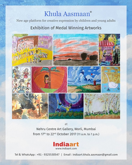 Khula Aasmaan presents the eagerly awaited exhibition of medal winning artworks at Nehru Centre Art Gallery, Worli, Mumbai from 17 October to 22 October 2017. On display will be artworks which have won Gold, Silver and Bronze medals in the previous Khula Aasmaan contests - for the periods of October to December 2016, January to March 2017 and April to June 2017.
