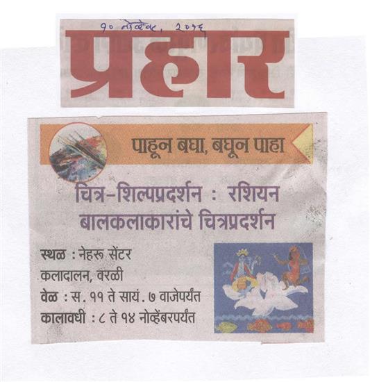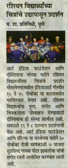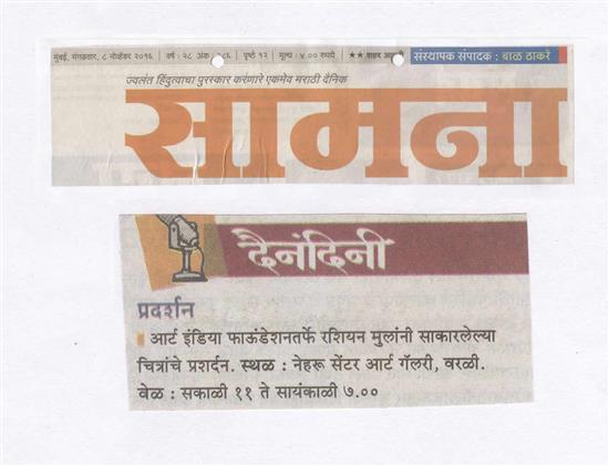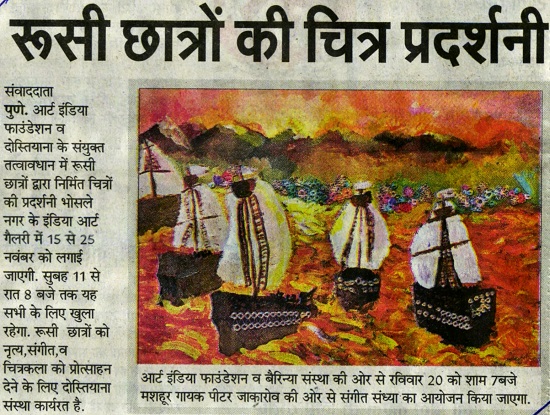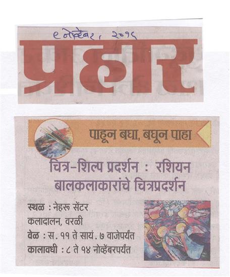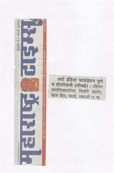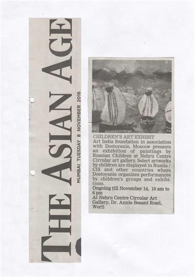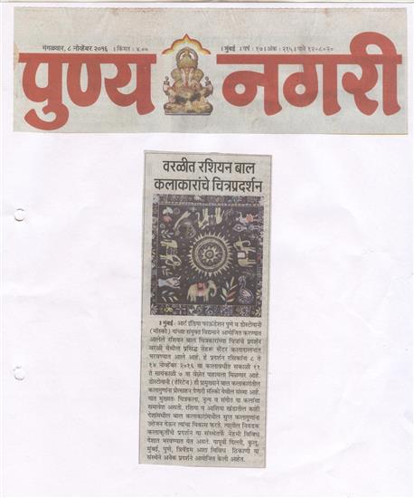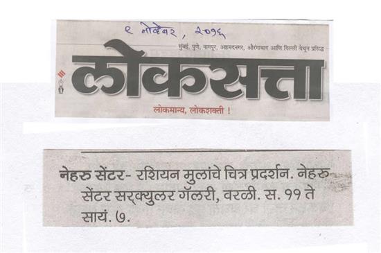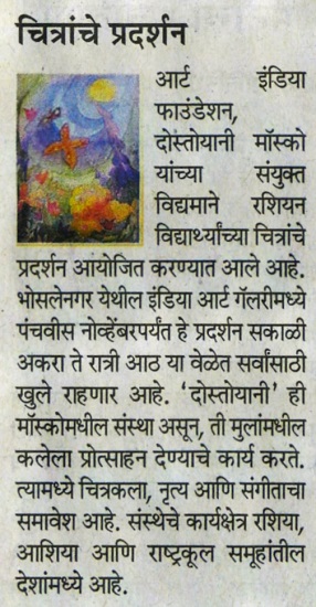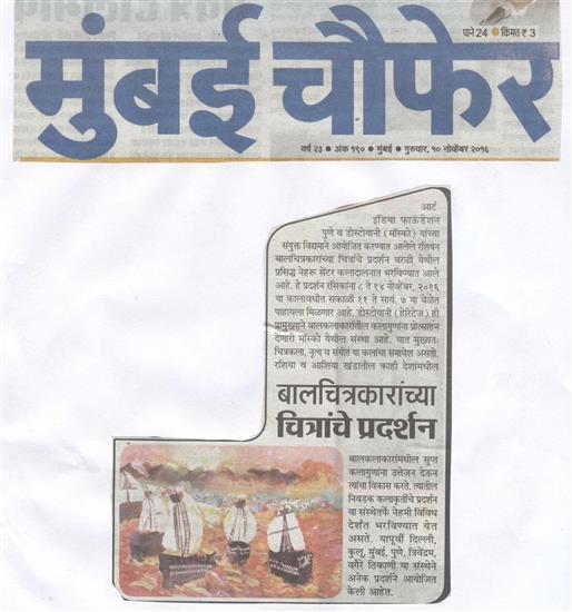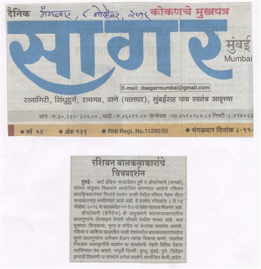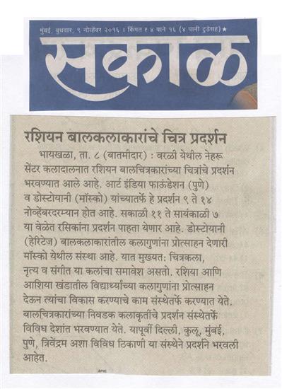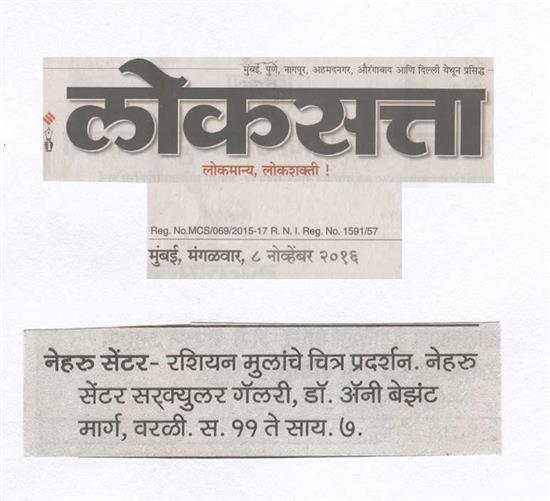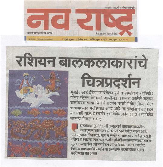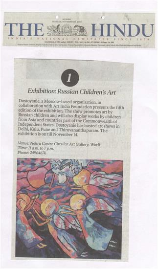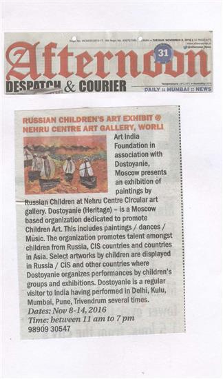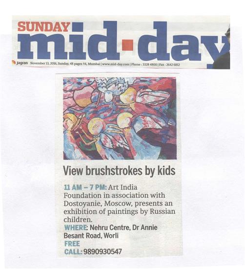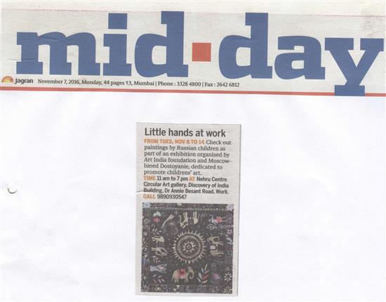 See the media coverage in leading print media publications for Russian children’s painting exhibition at Nehru Centre, Mumbai. The exhibition was held at Nehru Centre Mumbai from 8th to 14th November 2016. Subsequently this exhibition travelled to Indiaart Gallery, Pune from 15th to 25th November 2016.
