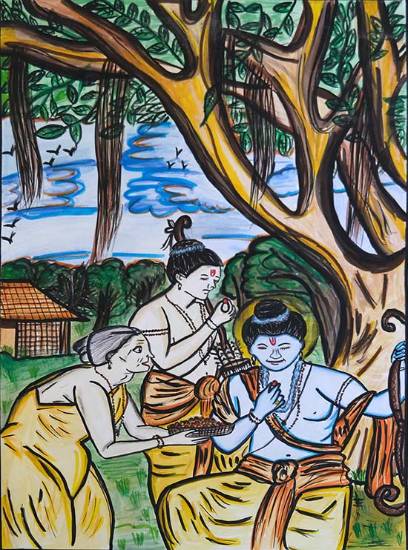 Want to Buy Shabari, the old lady giving berries to Lord Rama by Bhuvana Jagadheeswaran Acrylic on Canvas 16 x 12 inches 40.64 x 30.48 cm 5,000 ($68)