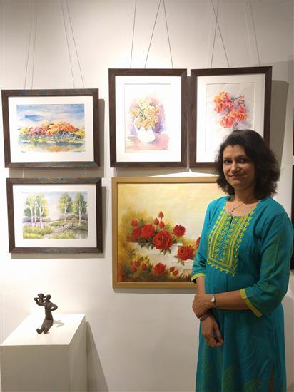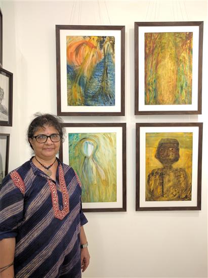 Amita Goswami with her paintings at Indiaart Gallery, Pune