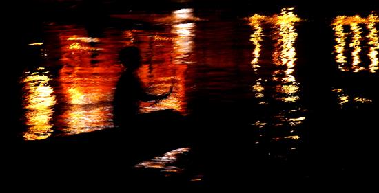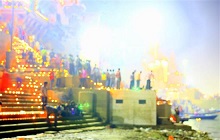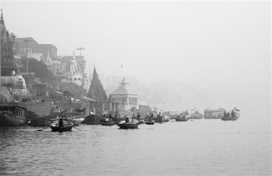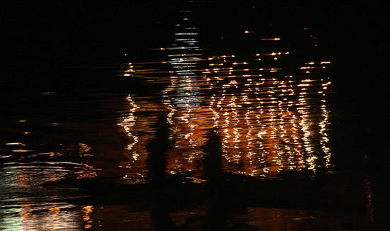 The ghats (riverfront steps), come demanding, the river with pilgrims chaotic, bathing, washing, the sacred rise to the resurrection, holy burning wicks dance on the river; the river tired with washed sins, profound, surging down the swaying locks of the aboriginal, the three-eyed god, alive now, full of life.