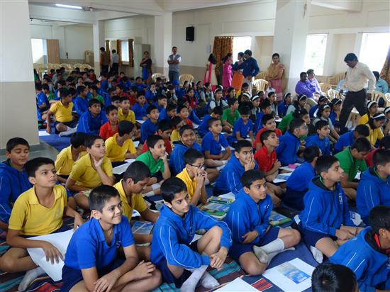 Children obesrving the painting demonstration by Chitra Vaidya during Khula Aasmaan workshop, New English Medium School, Pune
