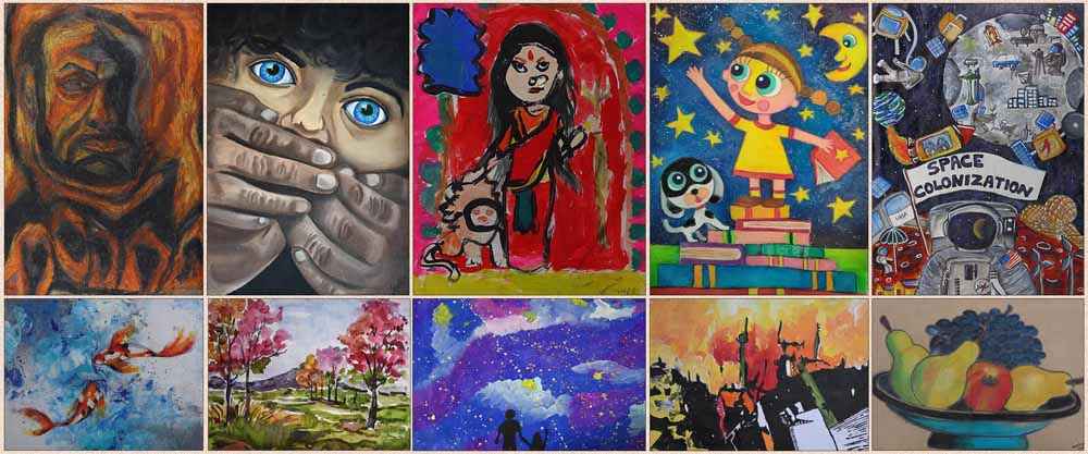 Children's Art Gallery features all those children who have been shortlisted and children who have won medals (gold medal, silver medal, bronze medal) from Khula Aasmaan art contest, drawing competition, painting contest, cartoon contest, doodle contest. Each child artist will be featured on a dedicated web page. Enjoy this beautiful collection of child art. This collection of children's art includes pencil drawings, drawings with color pencils, paintings done by crayons, oil pastels, sketch pens, gel pens, ink pens, watercolors, acrylic colors, oil colors and collage paintings. This large and diverse art collection includes artworks by children from all over India and beyond.