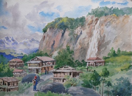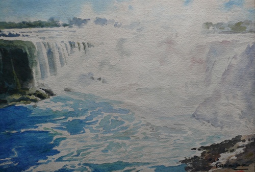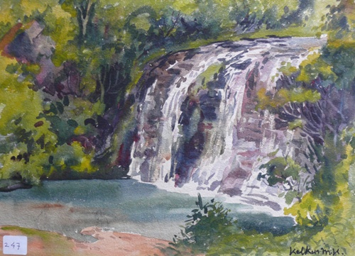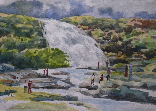 Shri. M. K. Kelkar painted Waterfalls when he visited Karnataka, Goa and Niagara Falls in Canada in watercolour.