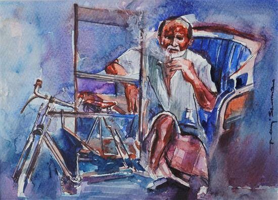 A moment of rest, painting by Young Artist Pankaj Sharma Bronze medal in Khula Aasmaan art contest for college students Keywords: Man , Riekshaw , Driver , smoking , smoking driver View Portfolio icon Share Facebook Twitter Whats App Pinterest Description -- Art Number 22232 Artwork Title A moment of rest Artist Name Pankaj Sharma Medium Watercolour on Paper Size 8.5 x 11.8 inches (21.59 x 29.972 cm) Information This painting by young artist Pankaj Sharma received a Bronze Medal in Khula Aasmaan student's art competition for January to March 2019. In this Painting I have shown a person who is a riekshaw driver, resting and smoking to remove falign. water colours have been used in colours. The expression on the persons chest has been primarily given priority.