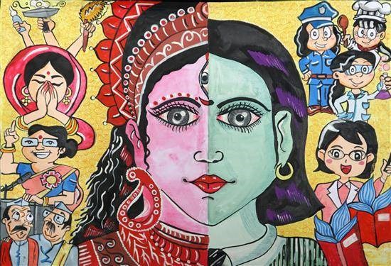 Women as Warriors, painting by Young Artist Jaysi Nigam Shortlisted in Khula Aasmaan students art competition Keywords: women , women empowerment , figurative , god , goddesses View Portfolio icon Share Facebook Twitter Whats App Pinterest Description -- Art Number 22506 Artwork Title Women as Warriors Artist Name Jaysi Nigam Medium Watercolour on Paper Size 16.53 x 11.75 inches (41.9862 x 29.845 cm) Information This painting by young artist Jaysi Nigam, Class 12 was shortlisted in Khula Aasmaan free art competition for children and college students for April to June 2019. My painting depicts women empowerment. Women empowerment is a topic which needs to be taken under consideration. Women are capable of doing anything but the society thinks differently. Women are considered as weak and are meant to do household works only. They are not given the opportunity to work outside of the house like other men do. They are often discriminated on various aspects. I wanted to show that women are no less than anyone and that is why I chose this topic particularly. Talking about the composition of my painting, in the middle, a girl is represented in two different faces. On the right, a girl is shown in school uniform because it is the right of every person to acquire education no matter if he/she is a boy or a girl. Everyone is equal. On the left, a goddess has been depicted. This is to show the society that inside each and every girl, a goddess resides. Goddesses are powerful not weak which indicates that a girl is not weak and she is capable of doing anything. In the background, different professions are been shown that a woman can pursue. These professions are pursued by men according to the society. There is profession that a woman cannot pursue. I have used water colours as the medium. I have used bright colours to make my painting attractive and to showcase the bright future of women. See the video about this artwork