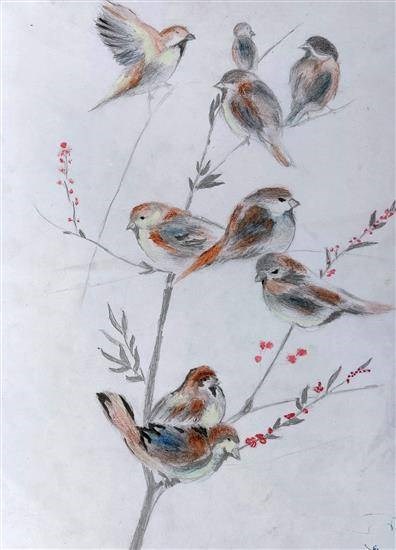Importance of Sparrow, painting by Young Artist Ajay Balchand Sharma Shortlist in Khula Aasmaan students art competition Keywords: Sparrow , Importance of Sparrow , Passeridae , plant View Portfolio icon Share Facebook Twitter Whats App Pinterest Description -- Art Number 22759 Artwork Title Importance of Sparrow Artist Name Ajay Balchand Sharma Size 14.96 x 10.23 inches (37.9984 x 25.9842 cm) Information In this picture we can observe that, it is an autumn season and sparrows are sitting on trees.Sparrow is simple and small sized commom birds. Nowdays, we can observe that number of sparrow is decreasing day by day. Radiation from cell phone towers interferes with navigational shills of sparrows, causing them to lose their sense of directiona nd leads them astry from their homes. Long term exposure to low level RFR has damaging effects on the nervous systrem & immune system of sparrows. This picture basically indicates that save sparrows. It just the relationship between the sparrows and human being in their daily life. It also tells us the importance of their existance in our life as well as environment. This painting by child artist Ajay Balchand Sharma was shortlisted in National Painting Competition by Khula Aasmaan and IISER Pune. Prize winning artworks from art contest by Khula Aasmaan and IISER Pune