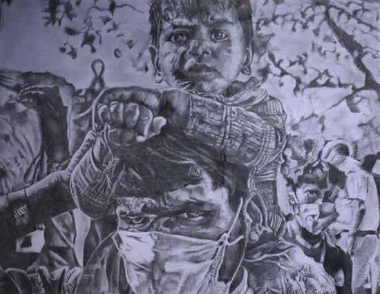 The crisis of Migrant workers in India during COVID-19 Gold medal in Khula Aasmaan art competition for young adults Keywords: migrant worker , child , man , man wearing mask , shades , light , shadow , texture background , portrait , the crisis of migrant workers View Portfolio icon Share Facebook Twitter Whats App Pinterest Description -- Art Number 23563 Artwork Title The crisis of Migrant workers in India during COVID-19 Artist Name Rahul Soren Size 8.27 x 11.69 inches (21.0058 x 29.6926 cm) Information I have lovingly drawn this portrait. You see on the foreground, a man wear a mask with his child and adding shades, light or shadow. Include texture background. This painting by young artist Rahul Soren (16 years) received a Gold Medal in Khula Aasmaan national art competition for young adults for April to June 2020. See the video about this artwork