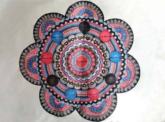 Mandala Depicting eteneral powers through balls and designed Shortlisted in Khula Aasmaan students drawing competition Keywords: peace of mind , mandala being sanskrit word , Purpose of Life , the nature of the universe , encourage introspection , awareness for peace of mind , meditative tool , spiritual exercise View Portfolio icon Share Facebook Twitter Whats App Pinterest Description -- Art Number 23682 Artwork Title Mandala Depicting eteneral powers through balls and designed Artist Name Anamika Mishra Information I am here to brief about my artwork which I titled as 'Mandala Depicting Eternal Powers Through Balls and Designs'. A mandala being Sanskrit word for circle is an artistic representative of higher thought and deeper meaning given as a geometric symbol used in spiritual, emotional or psychological work to focus one's attention, encourage introspection and awareness for peace of mind. In India, this term first appeared in Rigveda and is used as meditative tool and spiritual exercise in the belief systems of Jainism, Buddhism, Shintoism of Persian Art and Ishtar Star Symbol of Mesopotamia. This artwork defines a circle decorated with Imagery, Balls and various Designs which directs the mind of the observer or creator Inwards from the Outer Rim towards Deeper Reflection on the Meaning and Purpose of Life, the Nature of the Universe, the Substance and Reality of God, the True Nature of the Self, the underlying for m of Reality, Cosmological truths and other Spiritual, Psychological or Emotional aspects of one's life. Here I have drawn 3 different colored balls of Red, Blue and Black where Red ball shows the 'Fire', Blue ball shows the 'Water' and black one shows the 'Earth' which are the 3 basic Tatvas of Nature and Human life. In Hinduism, this is known by adherent as 'Sanatan Dharma- the Eternal Order' which was established by all Powerful Supernatural Entity. This artwork basically describes the working, arrangement and management of these three most important factors of life. This painting by young artist Anamika Mishra (18 years) received a Shortlisted in Khula Aasmaan students drawing competition for October to December 2020.