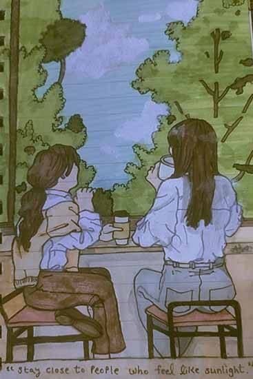Best Friend are like a Sunshine painting by Alveena Keywords: Best Friend are like a Sunshine , friends , sunshine , girls , figurative , friendship , illustration , best friends View Portfolio icon Share Facebook Twitter Whats App Pinterest Description -- Art Number 27990 Artwork Title Best Friend are like a Sunshine Artist Name Alveena Medium Watercolour on Paper Size 7 x 5 inches (17.78 x 12.7 cm) Information I redrew this illustration. I saw it somewhere, I really liked it because I think that best friends can be so precious. When they sit next to you, drink a cup of coffee with you, even if they don't say anything, their presence too is a reward. That's why they are like sunshine who gives you vitamin happiness.